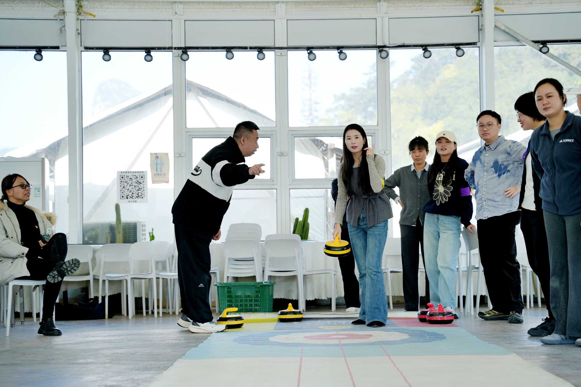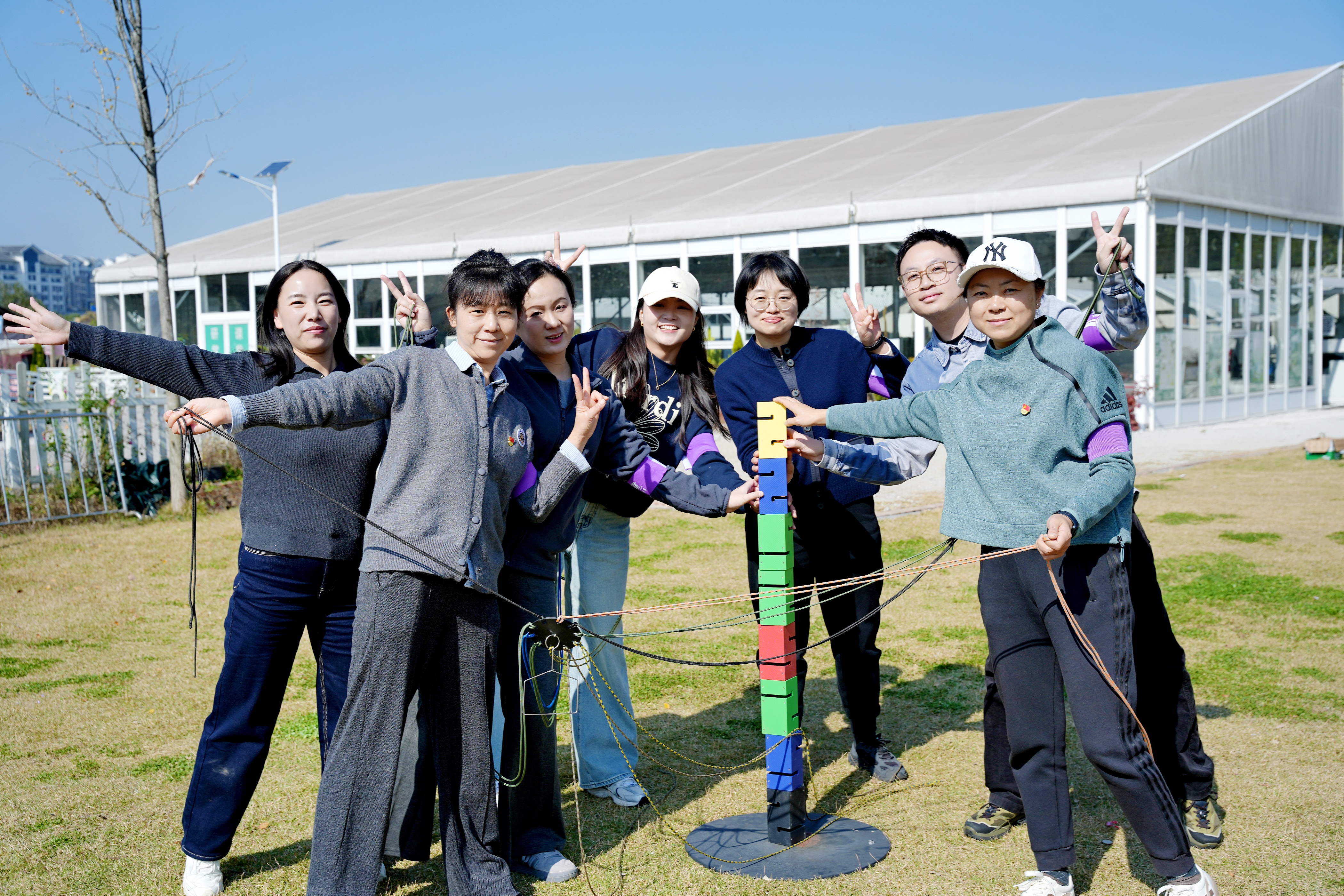 活动在 “破冰行动” 中拉开帷幕,教练通过生动讲解活动意义、组织团队组建与展示,迅速点燃现场氛围,让大家快速建立团队归属感,同时明确培训纪律、安全及环保要求。随后的 “合力筑塔” 项目中,各团队成员拉紧绳索、协同控制塔钩,精准搭建模型,在比拼速度的过程中深化协作意识;“冰壶争霸赛” 则以旱地冰壶为载体,教职工们通过策略讨论与战术配合,或精准投掷占位,或巧妙击出对方冰壶,在欢声笑语中提升团队默契,深刻体会 “团队共赢” 的意义。