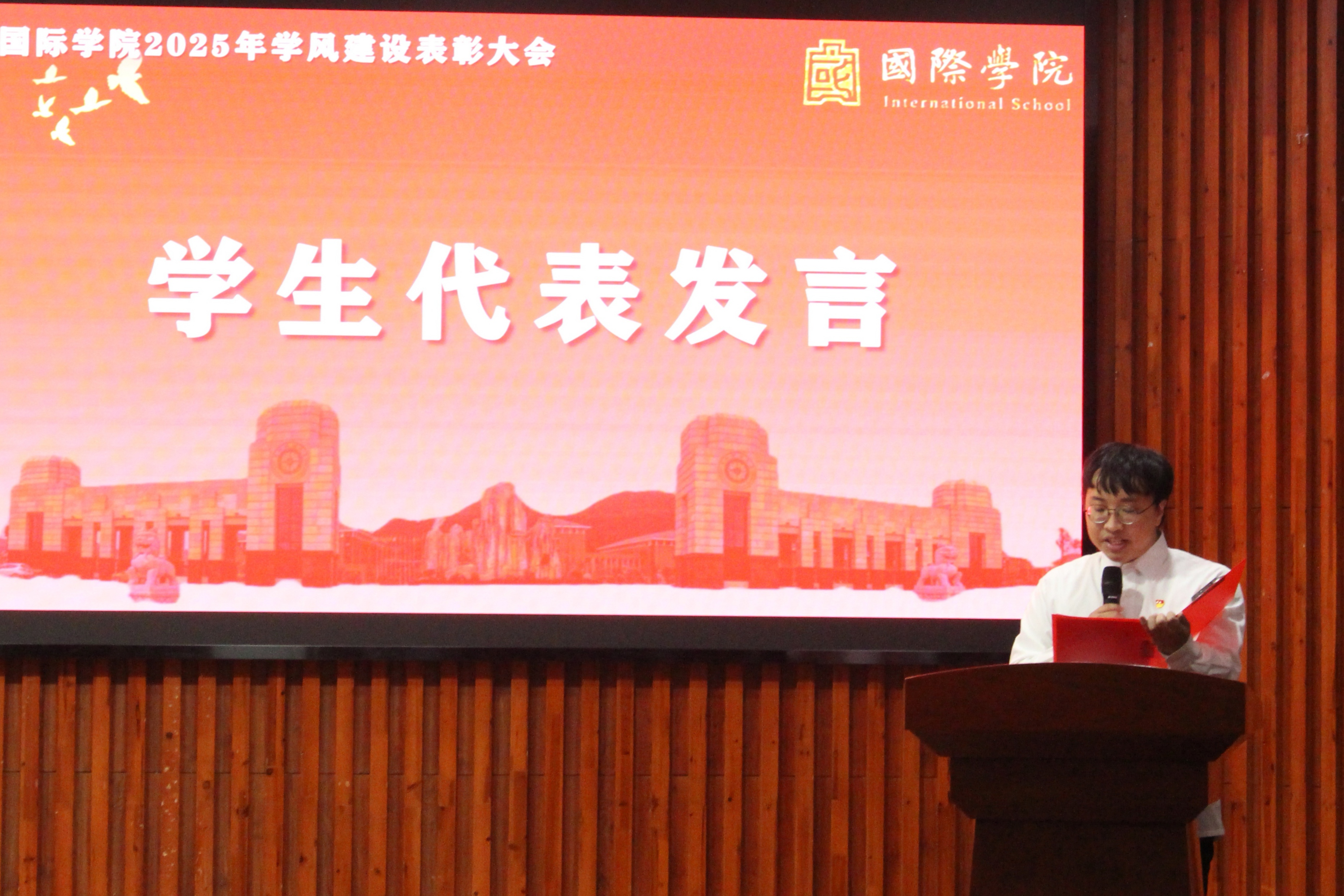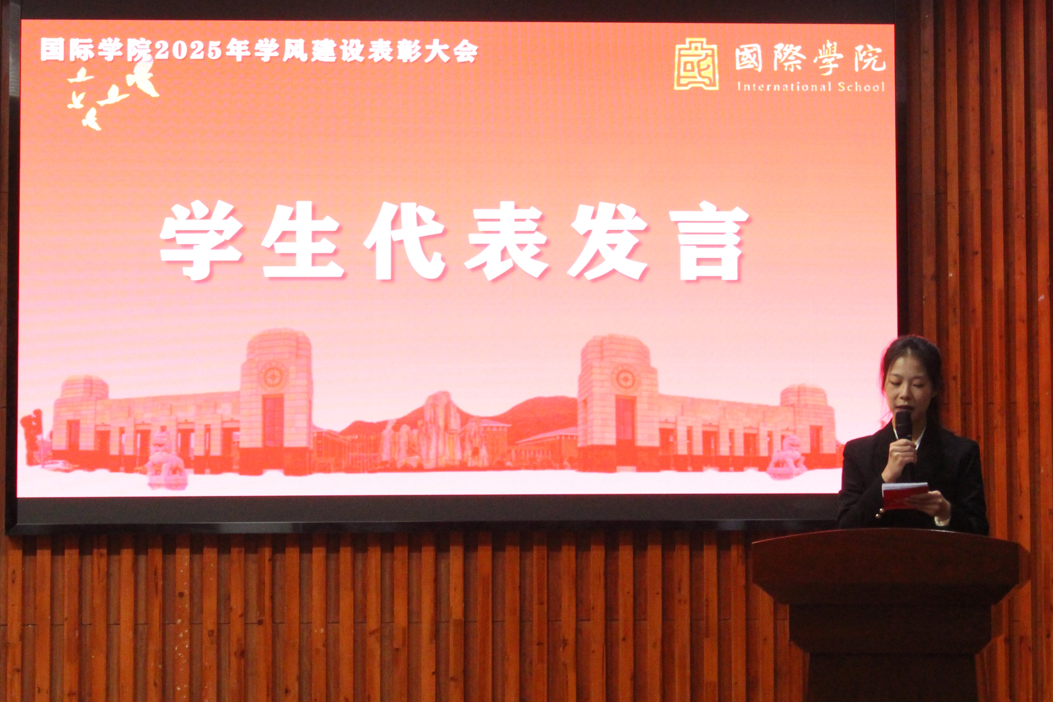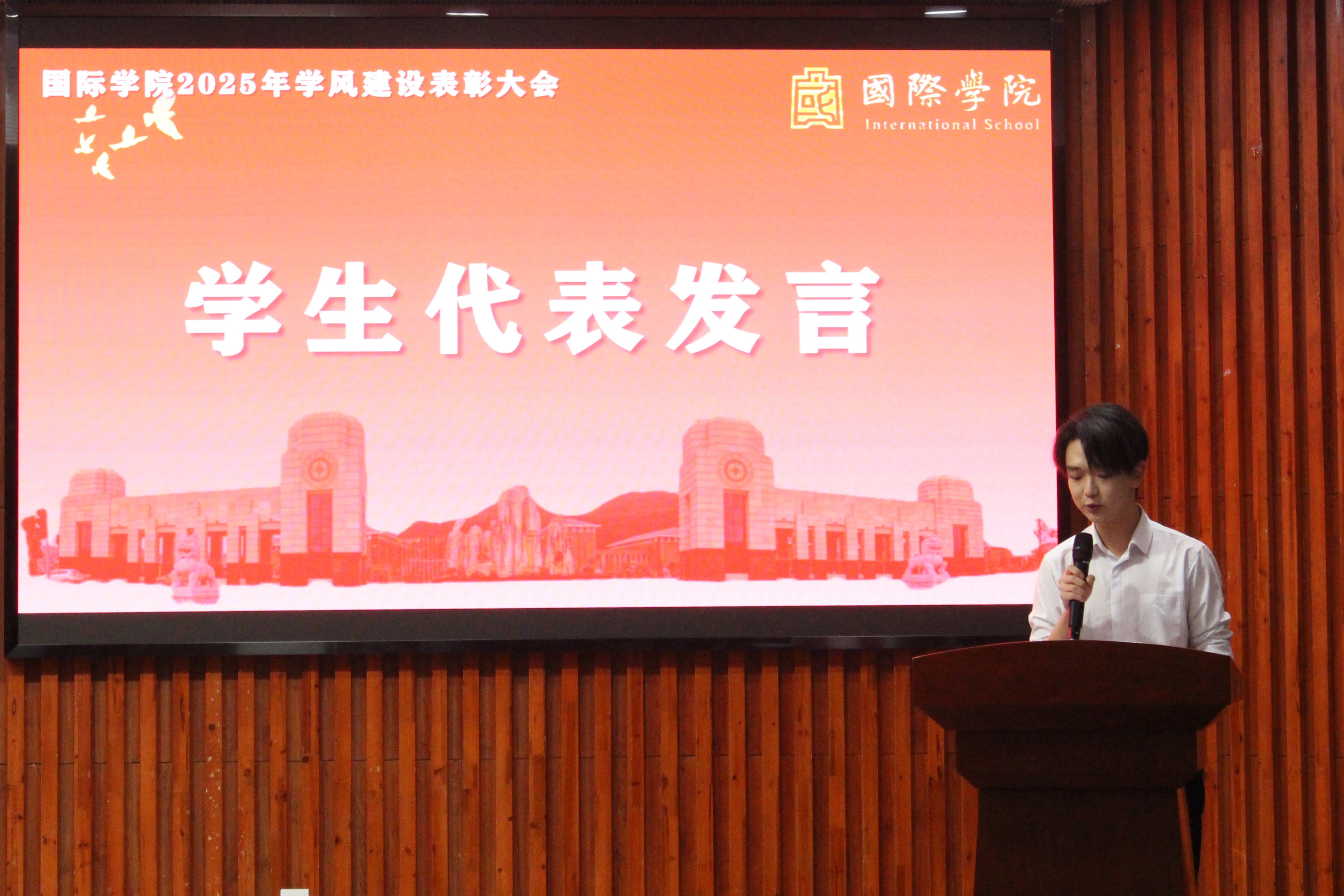 受表彰的先进个人和集体代表先后发言。他们分别围绕国际化培养模式的成长体验、“五育并举”的班级建设实践、从迷茫到坚定的学业心路历程、以及创新项目攻坚的团队协作感悟等内容,分享了各自在专业学习、实践创新与全面发展方面的收获与思考,充分展现了国际学院学子勤学笃行、追求卓越的精神风貌,并对学院的悉心培养表达了真挚的感恩之情。