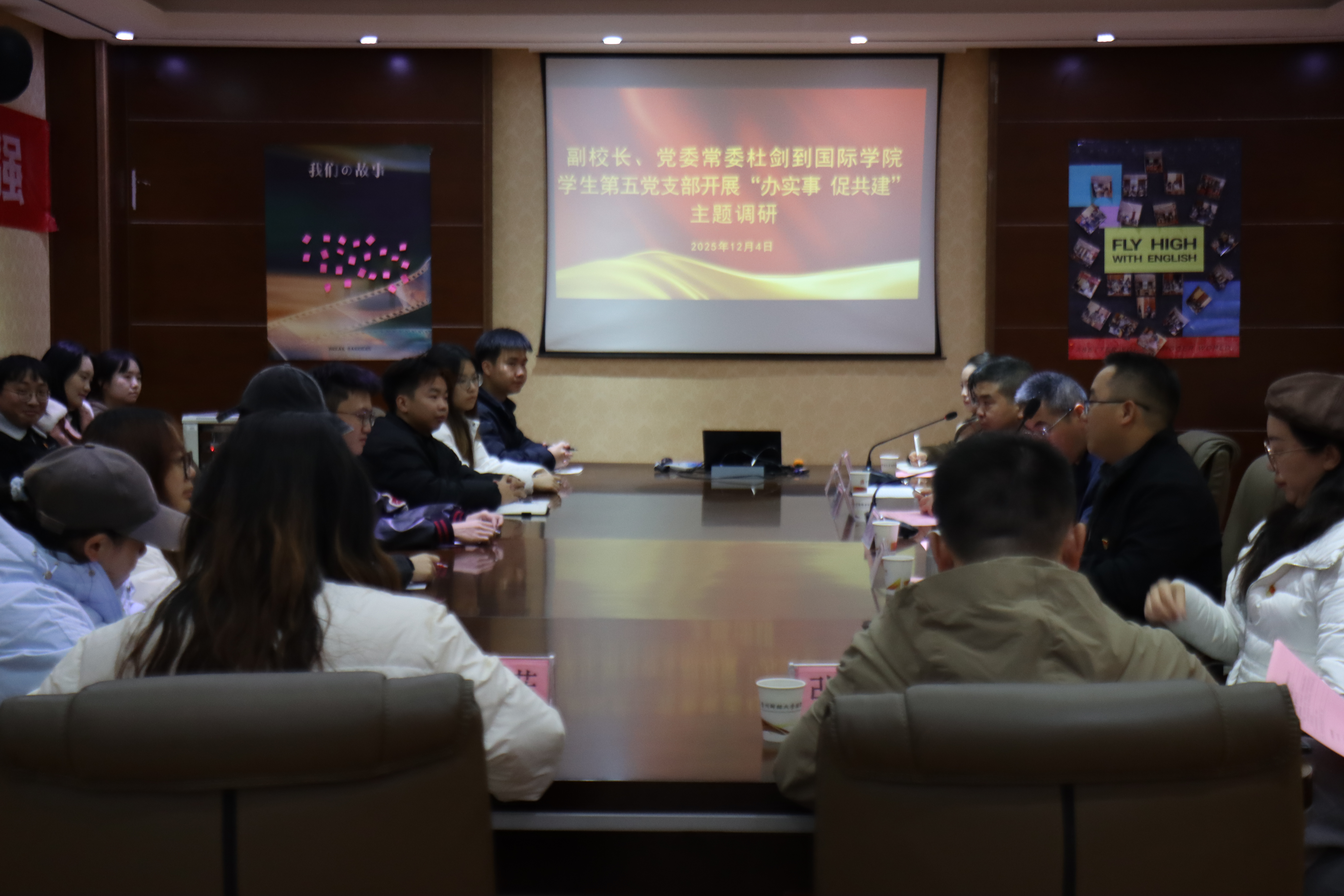 (国际学院 吴浪 图文报道)为落实党建工作要求,深化校领导联系支部办实事机制,推动支部间资源整合、协同发力,12月4日在西区正德楼一楼贵宾厅,联系支部领导副校长、校党委常委杜剑出席支部“办实事 促共建”主题调研暨办实事活动。党委保卫部党支部宣传委员田再时、应用经济学院本科生第一党支部书记杨显瑜、国际学院学生第五党支部书记吴浪及党员代表参会,国际学院党委副书记古鸿宇列席。