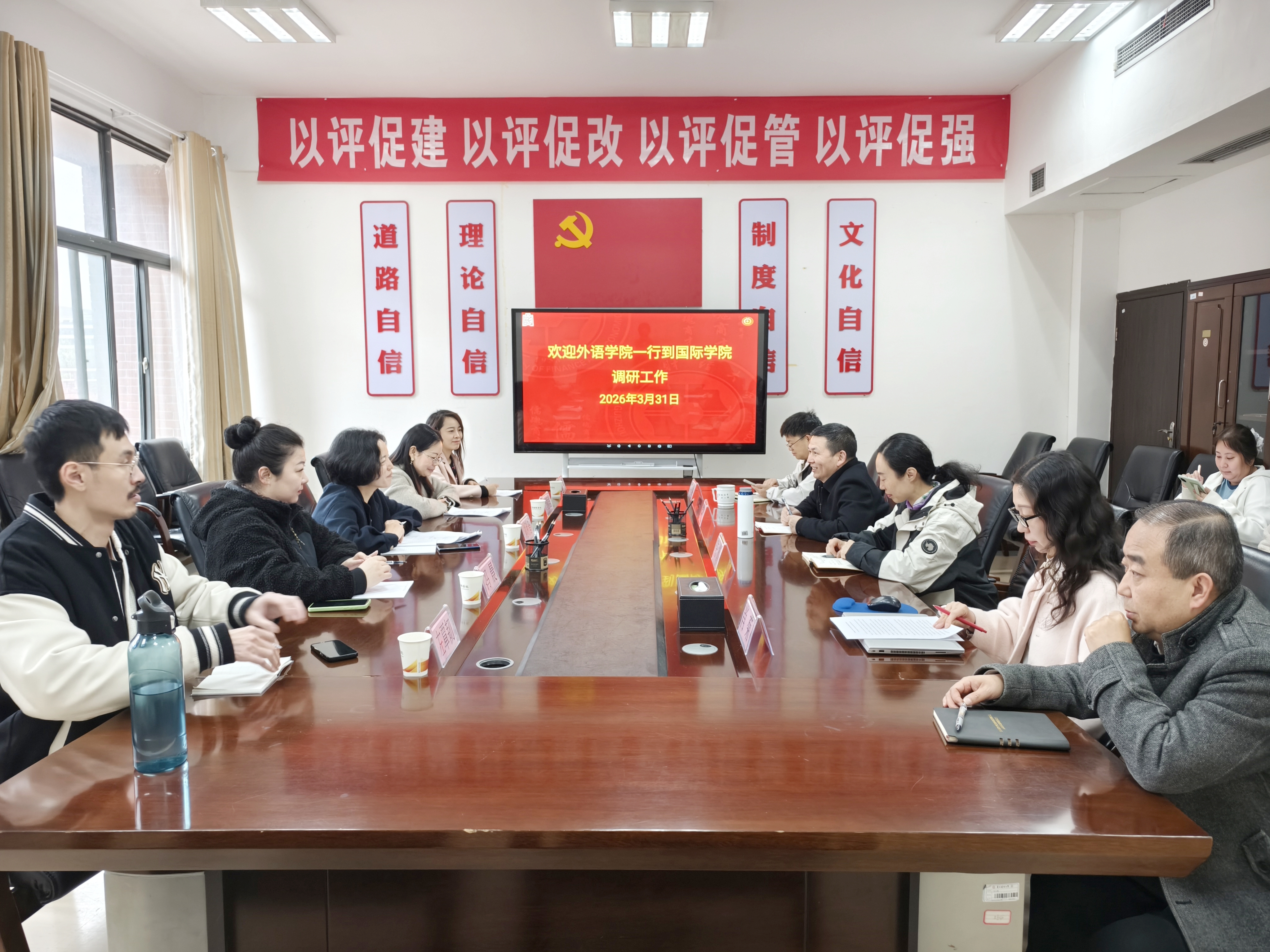 (国际学院 李薇薇 图文报道)3 月 31 日,外语学院副院长(主持工作)刘利音、副院长唐丽君一行莅临国际学院,围绕英语教学提质工作开展调研座谈。国际学院院长姜友文、党委副书记陈嵩、副院长邹晓峰及相关科级干部参加会议。