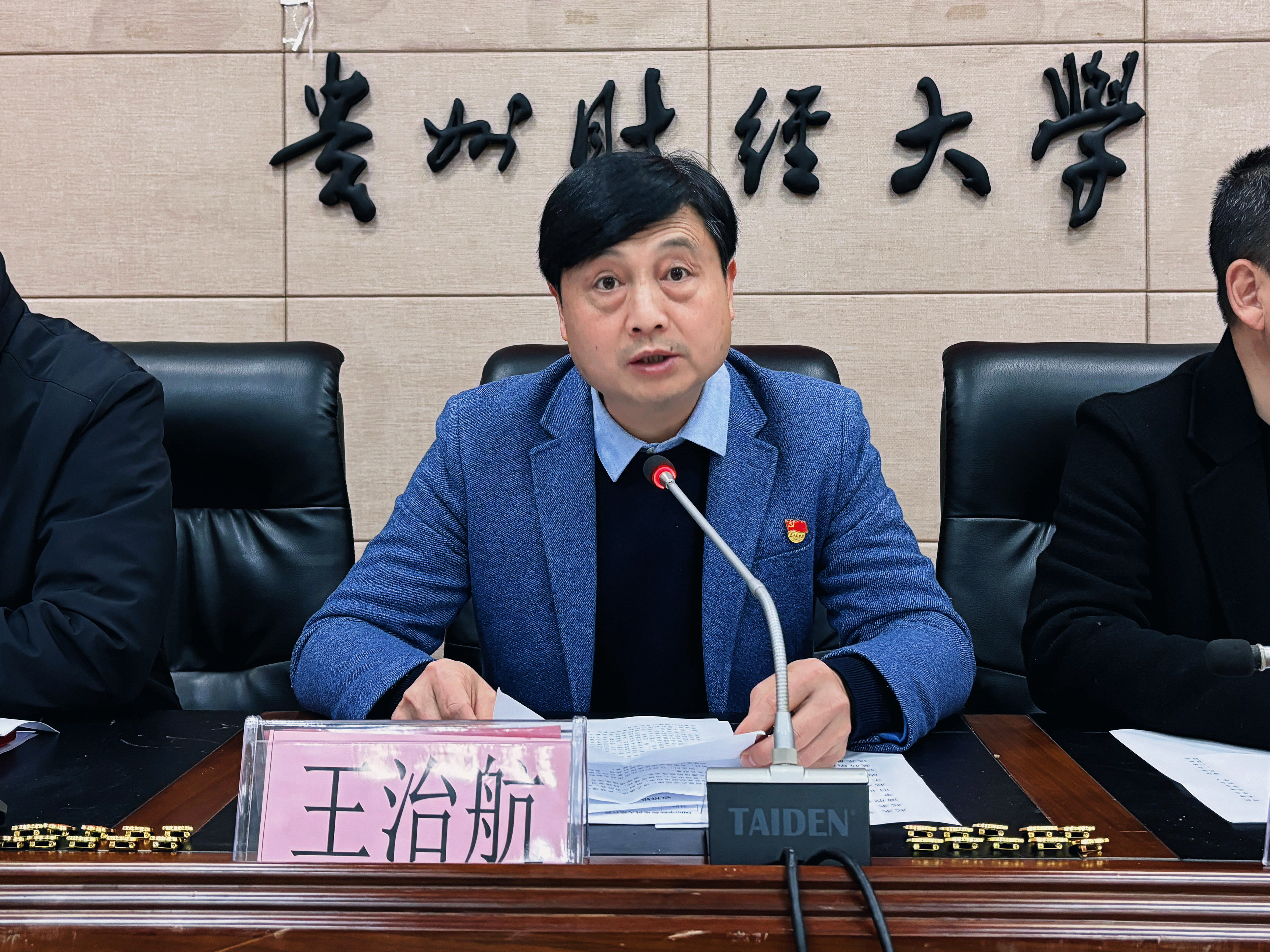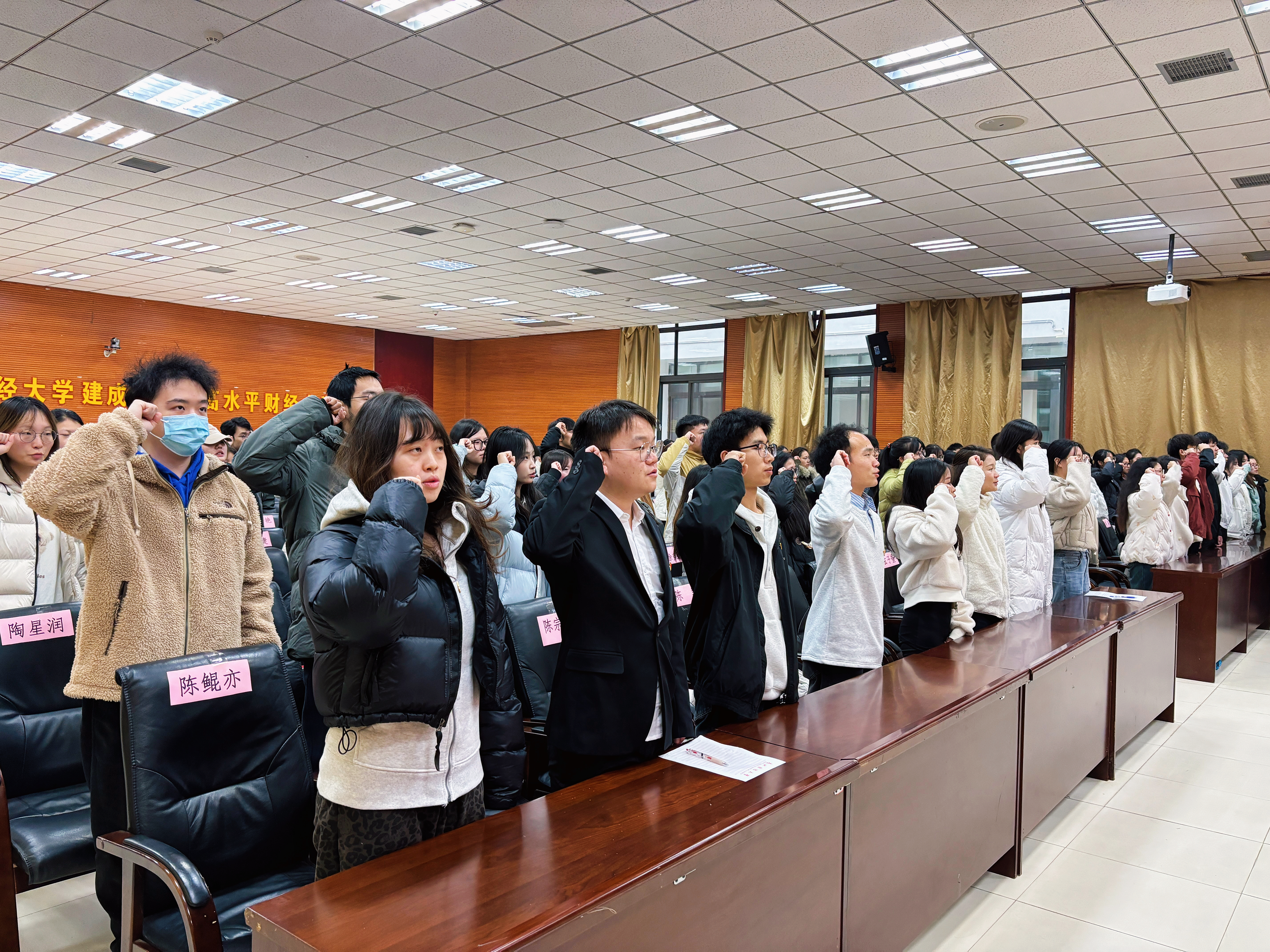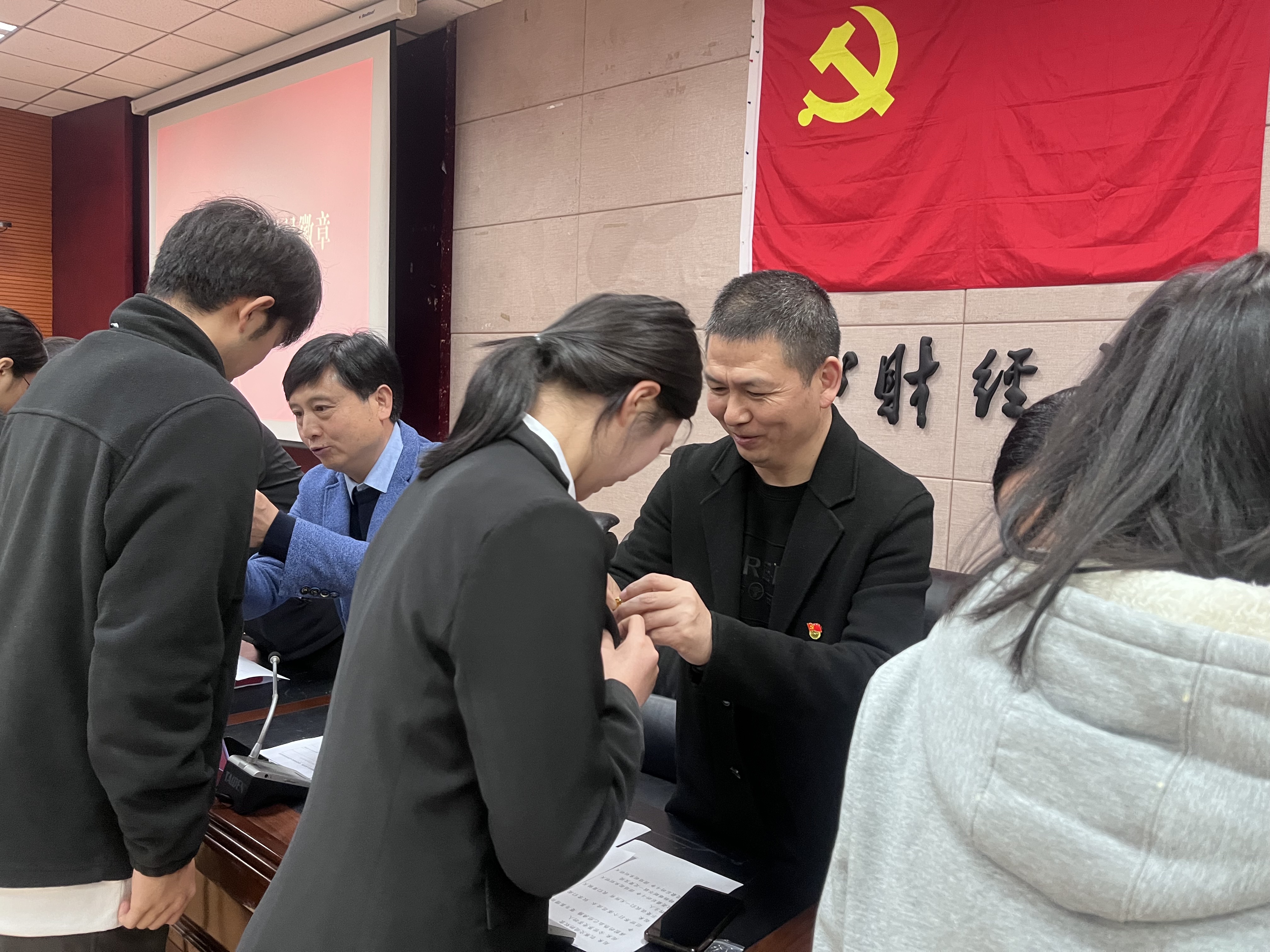 陈嵩宣读学院党委批复文件,各领导与党支部书记为新党员佩戴党员徽章,进一步强化身份认同、传递组织对新党员的期许。随后,王治航带领全体党员面向党旗庄严宣誓,激昂的誓词彰显着党员们的赤诚忠心。