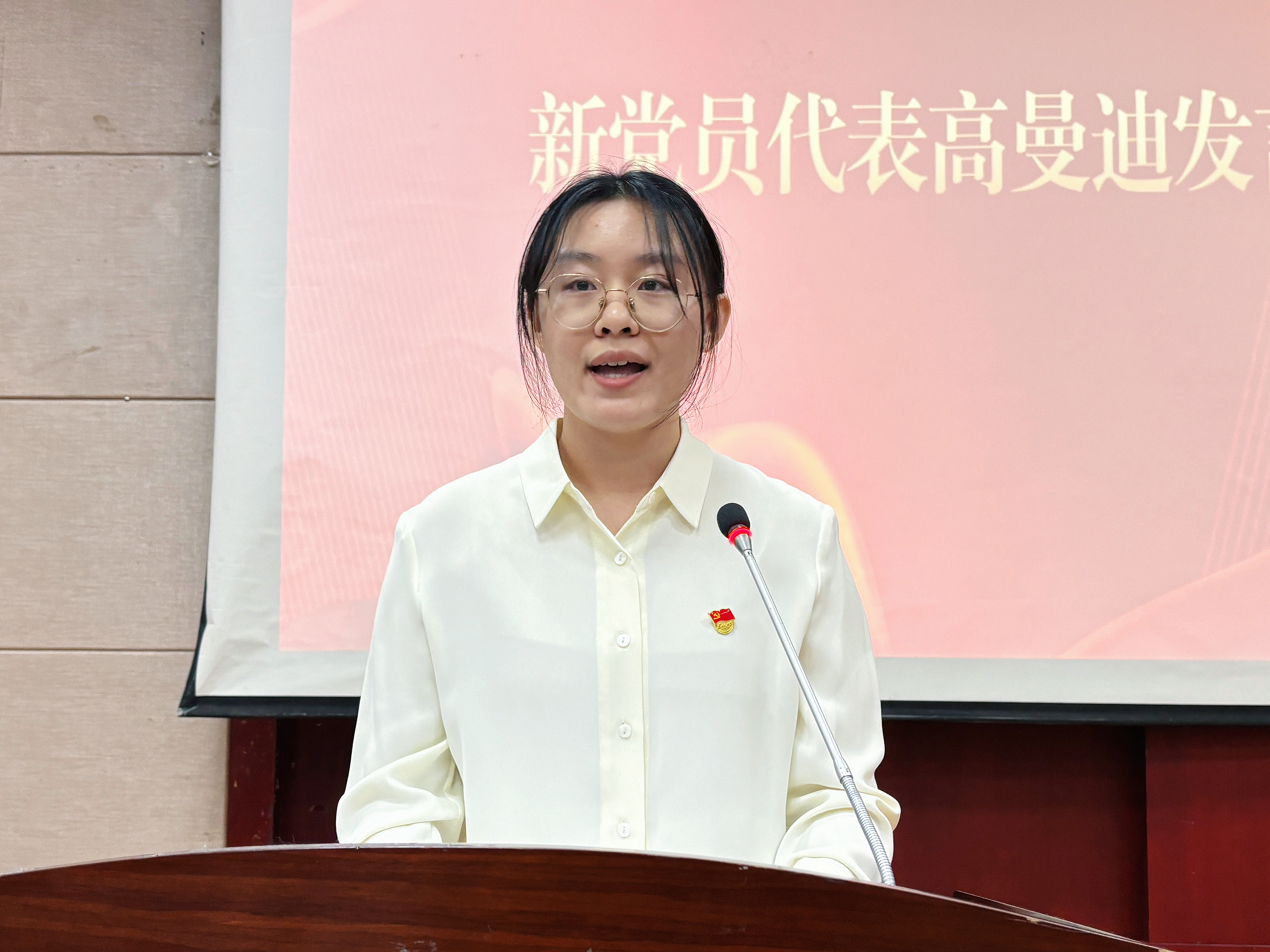 新党员代表高曼迪发言,表示将把党的宗旨融入日常学习与生活,以党员标准严格要求自己,主动担当,积极作为,为党和国家事业贡献力量。