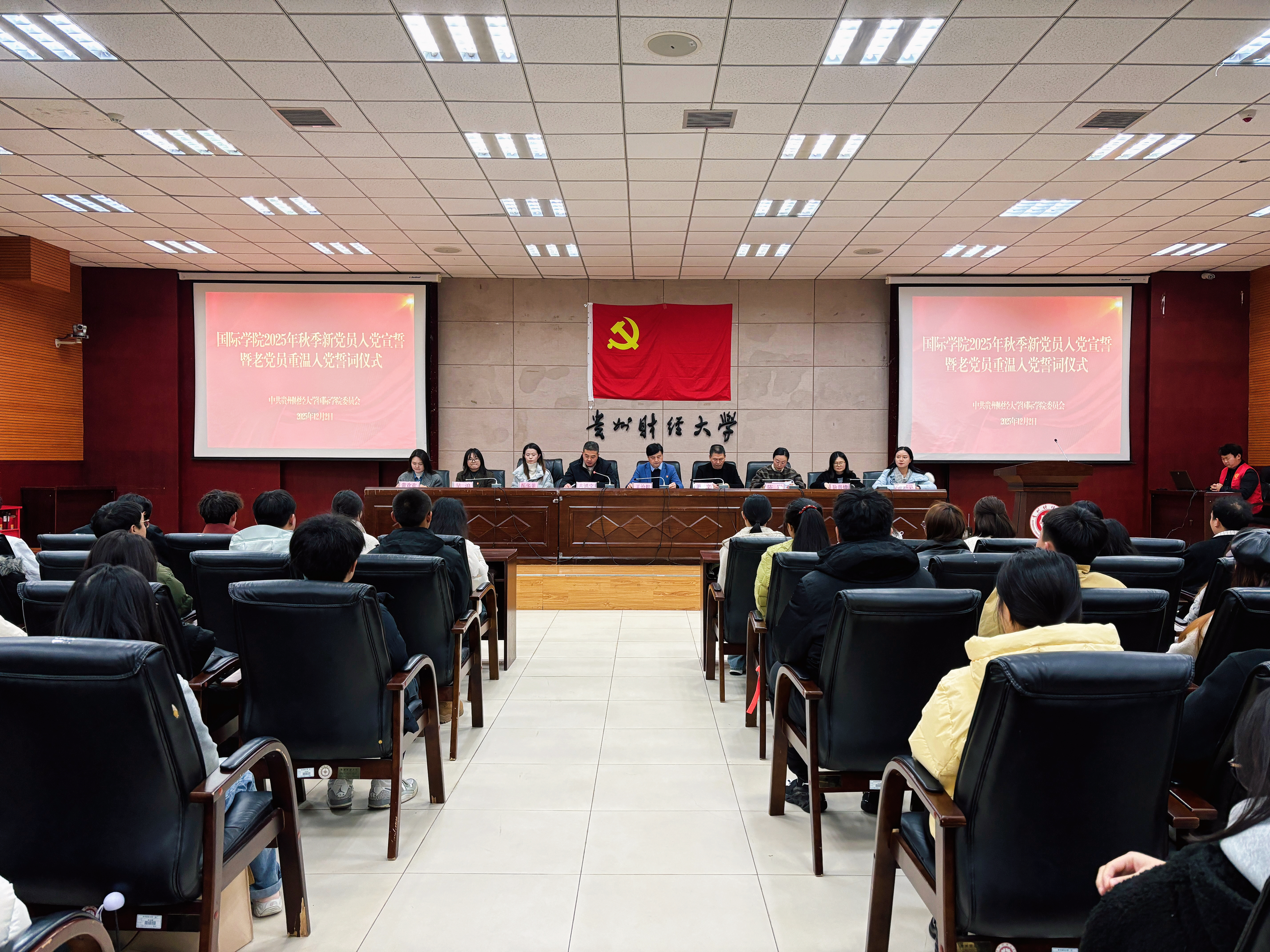 (国际学院 颜岫影 报道|摄影 唐芯兰)12月2日中午,国际学院在正德楼114报告厅开展2025年秋季学期新党员入党宣誓暨老党员重温入党誓词活动。学院党委书记王治航、院长姜友文,党委副书记古鸿宇、陈嵩及各党支部书记出席,78名新发展预备党员与各支部老党员参加,宣誓仪式由古鸿宇主持。