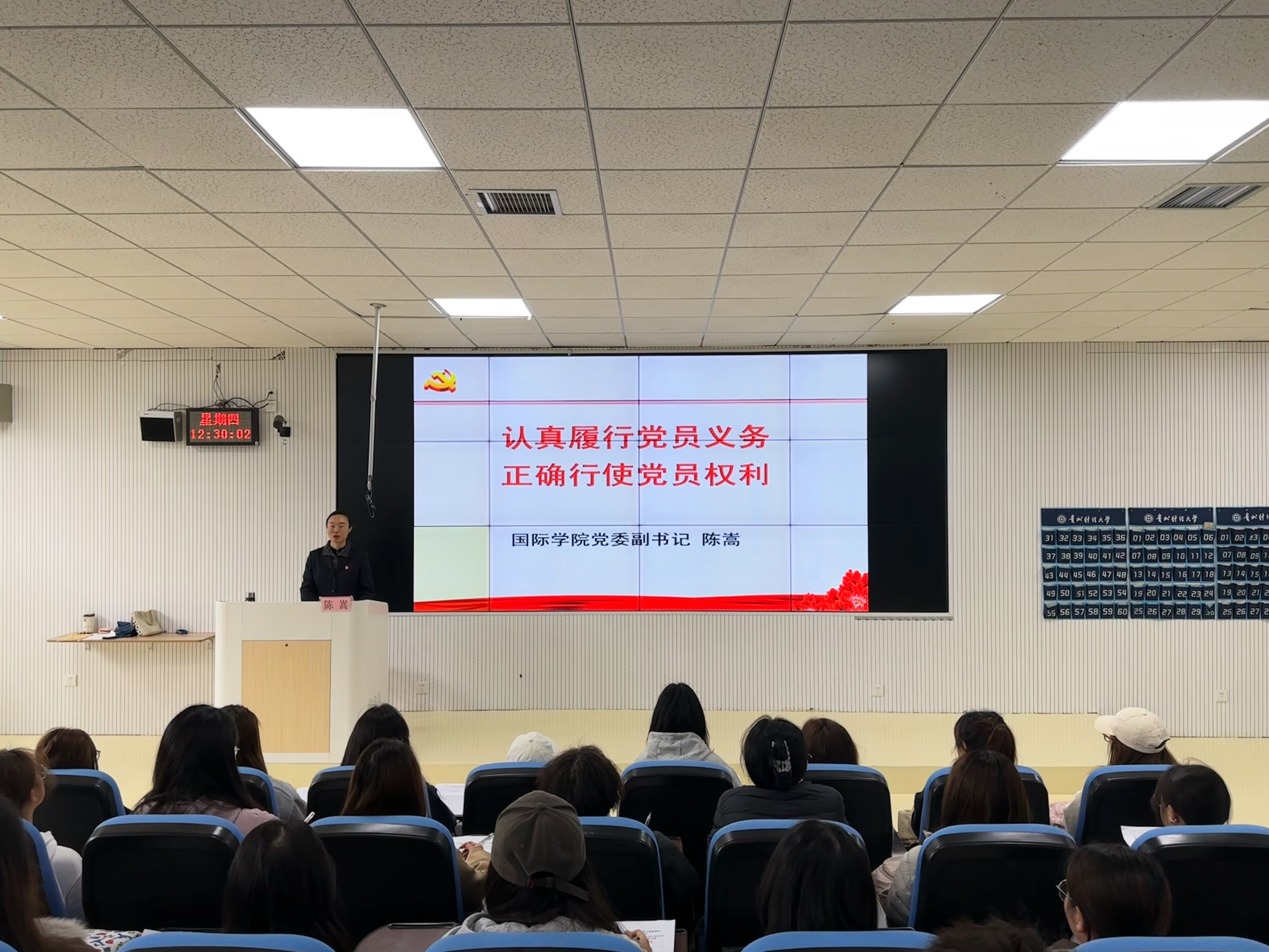 (国际学院 汪文阳 报道|摄影 张誉敬 罗紫晗)3月26日中午,国际学院党委副书记陈嵩在乐学楼102教室为2026年春季入党积极分子作“认真履行党员义务 正确行使党员权利”专题党课。