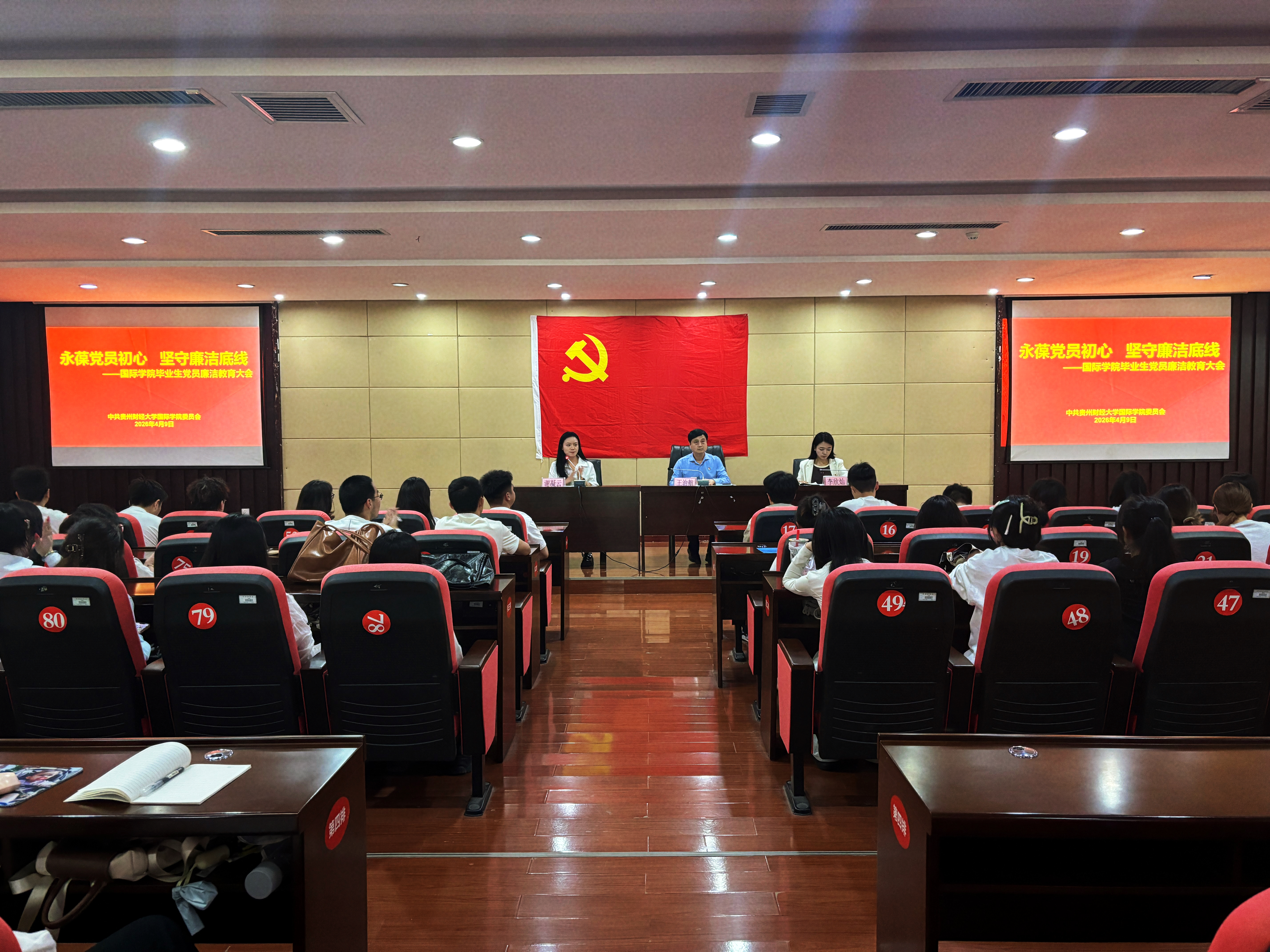 (国际学院 吴尉铖 报道|摄影刘冠夫 颜岫影)4月9日中午,国际学院党校在正德楼115报告厅开展“永葆党员初心,坚守廉洁底线”毕业生党员廉洁教育大会。国际学院党委书记王治航、正科级专职组织员李欣灿出席本次会议,115名毕业生党员和各支部委员参加。会议由党政办公室老师谢凝云主持。