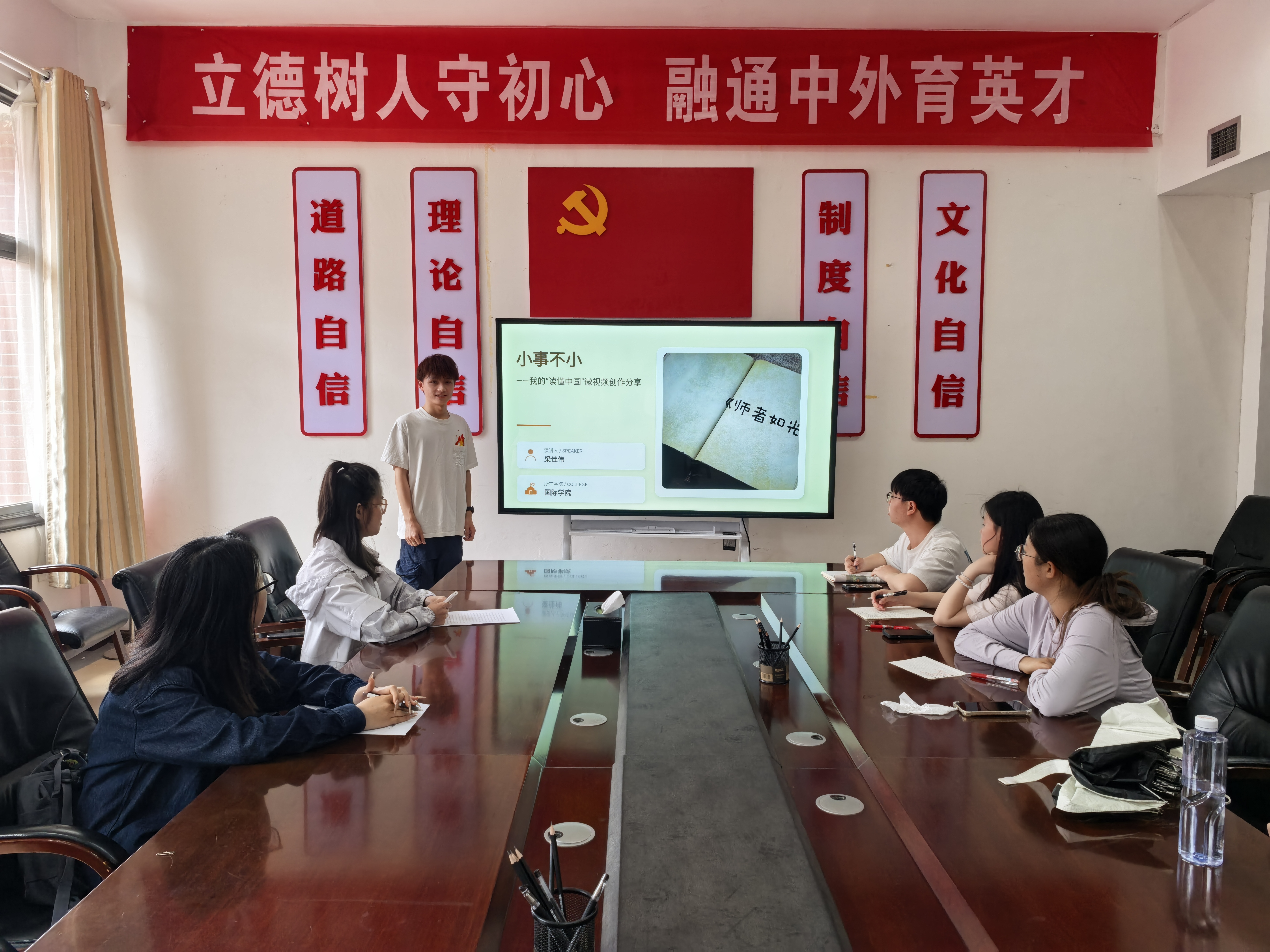 分享会上,学长学姐们以生动且接地气的方式复盘了去年微视频的创作全过程。他们从选题、脚本撰写、实地拍摄、素材剪辑到成品优化,逐一进行了细致讲解,详细介绍了所需工具、拍摄镜头规范、采访设问技巧以及脚本编排方法等关键环节。谢凝云对各位分享者的用心与付出表示感谢,并表示希望同学们在今年的“读懂中国”活动中继续精进本领,提升个人技能,结合“读懂中国”活动主题,认真准备参赛作品,力争再创佳绩。