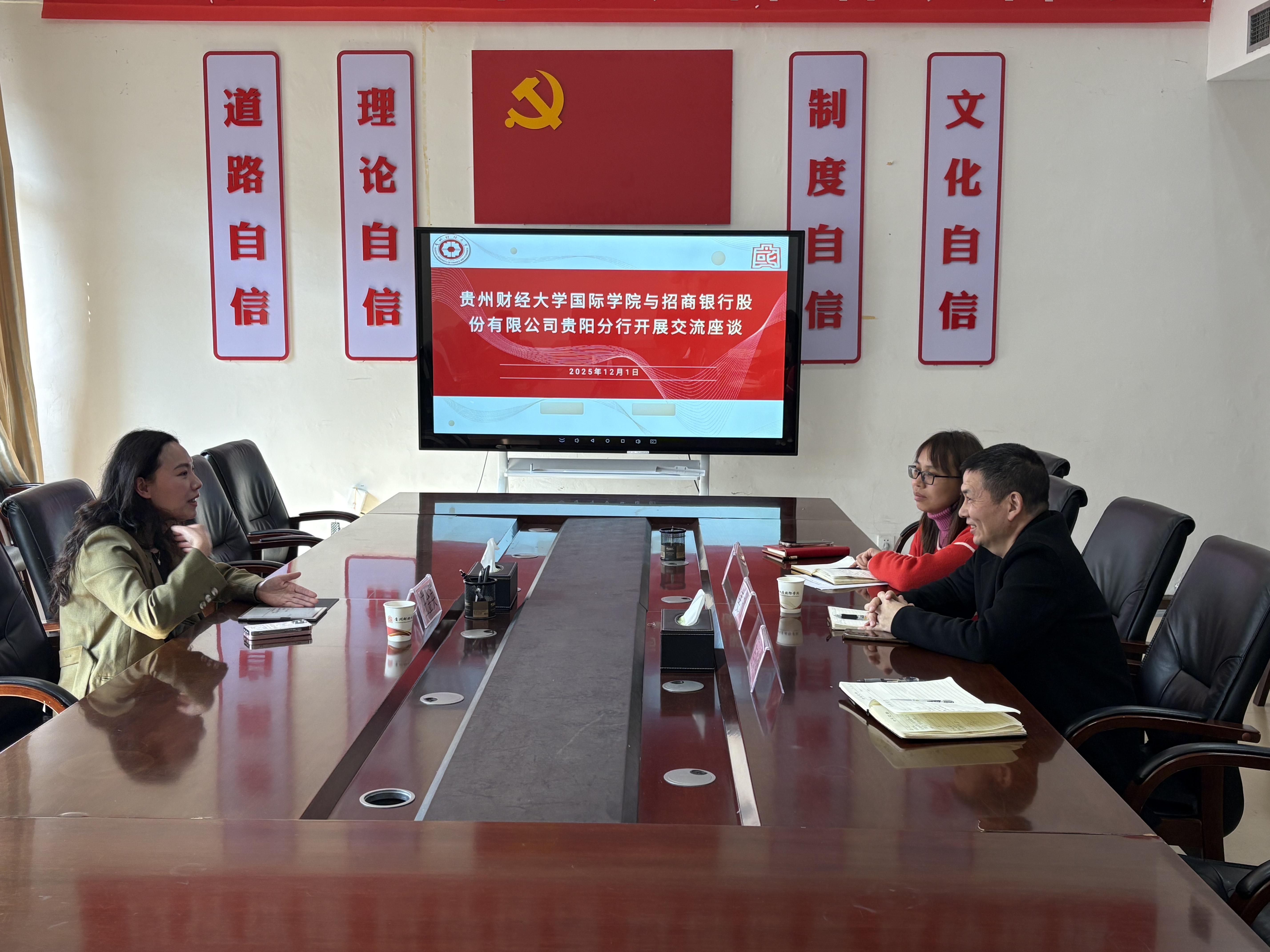 (国际学院 沙静 图文报道)12月1日,国际学院与招商银行贵阳林城西路支行在正德楼413开展了院企合作交流座谈会。招商银行贵阳林城西路支行行长庄金英,国际学院院长姜友文、教务管理科老师沙静、程姣燕出席座谈。