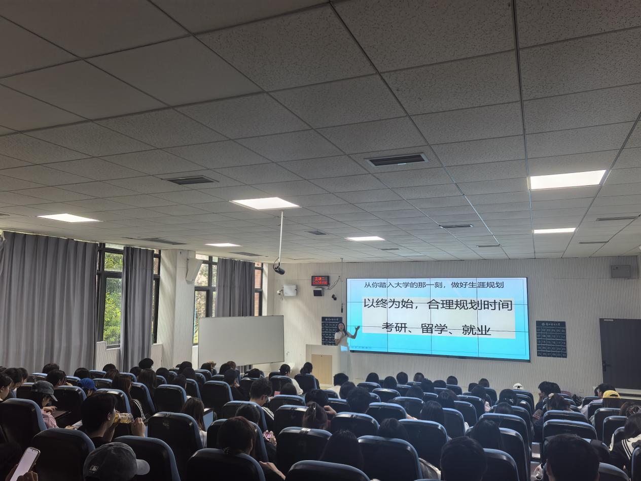 讲座中,龚格格从考研、留学、就业三大方向出发,结合数据分析和实际案例,为在场学生提供了清晰的升学规划建议。她指出,大学生应以终身学习为目标,合理规划时间,科学选择适合自己的升学路径。无论是国内考研还是境外留学,同学们都需要结合个人兴趣、专业发展和就业趋势进行综合考量。龚格格还详细介绍了热门留学目的地的升学优势,包括美国、英国、澳大利亚、新加坡和中国香港等地,并展示了各地区院校的QS世界排名情况,帮助学生直观了解全球顶尖院校的学术实力和专业优势。通过详细的考研数据分析和趋势解读,让学生对热门专业的竞争情况和就业前景有了更加清晰的了解。