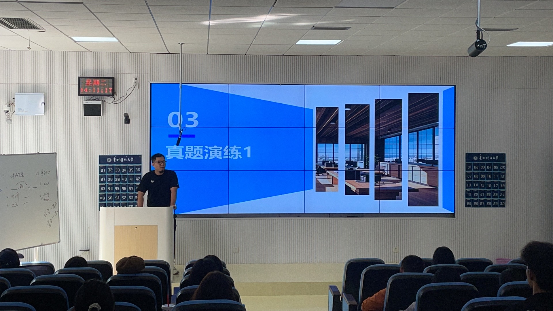 孙天玥首先从四级考试的基本结构、题型分布及分值占比切入,结合最新考试数据,深入分析了考试趋势。他通过梳理历年考试真题,明确指出重点题型与高频考点,帮助同学们精准锁定复习方向。针对考试中难点的翻译部分进行了详细拆解,并结合实例分析,助力学生掌握翻译核心技巧。同时,孙天玥特别强调语法结构与逻辑表达的重要性,建议学生在日常练习中多积累常用句式与表达方式。为让学生更直观地理解考试技巧,讲座还设置了真题演练环节。通过对真实试题的逐句解析,现场示范如何快速抓取关键词、理清句子结构,进而实现高效作答。