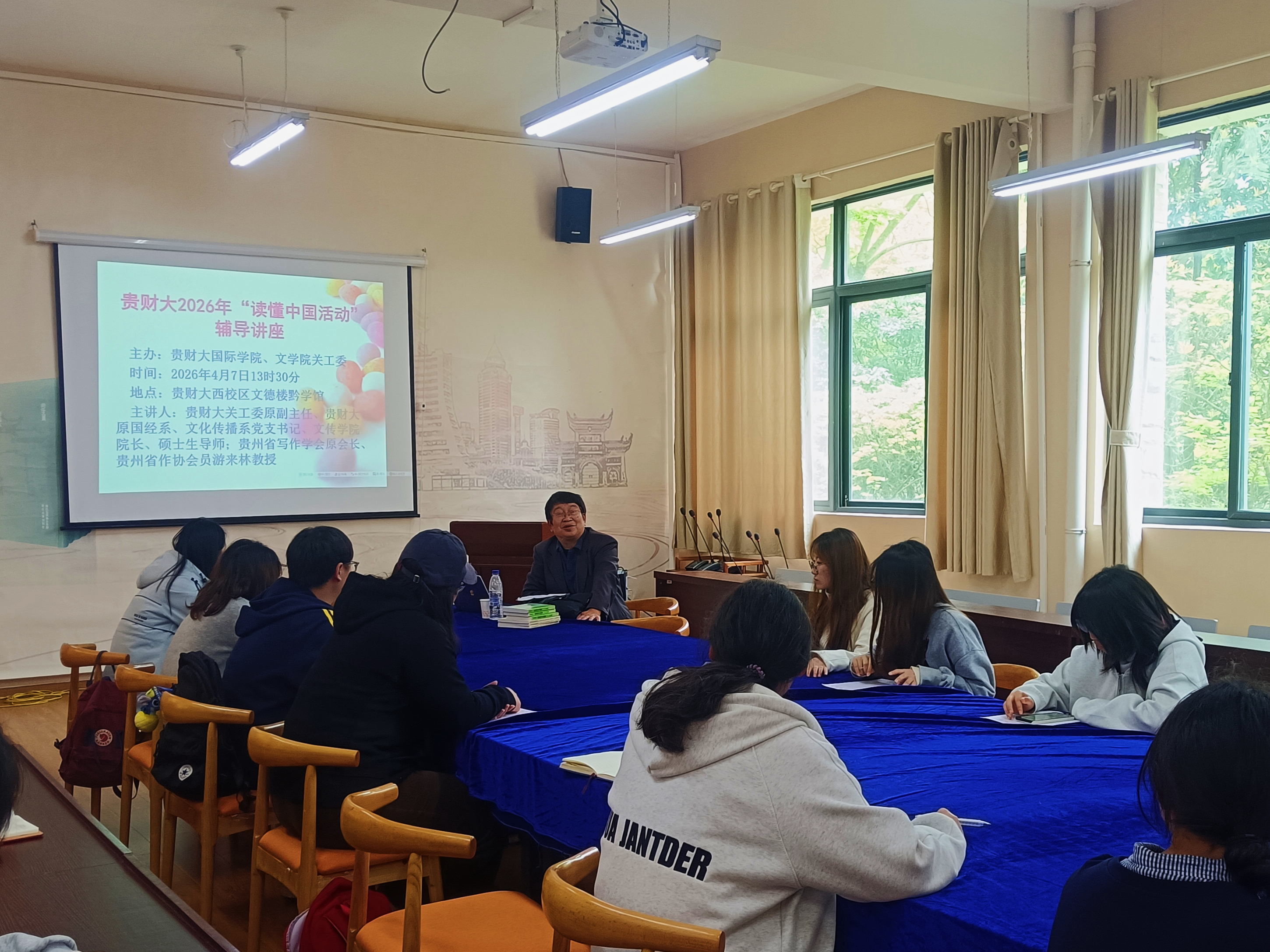 (国际学院 汪文阳 图文报道)为深入推进“读懂中国”活动有序开展,创新大学生思想政治教育形式,引导青年学子传承红色基因、弘扬长征精神,4月7日下午,国际学院关工委联合文学院关工委在文德楼黔学馆举办2026年“读懂中国”活动辅导讲座。本次讲座由校关工委原副主任游来林教授主讲,参赛学生23人参加。